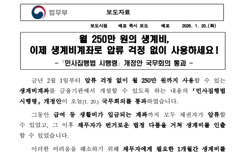 - 생계비 통장: 2026년 2월 1일부터 시행, 1인 1계좌, 월 250만 원 압류 금지