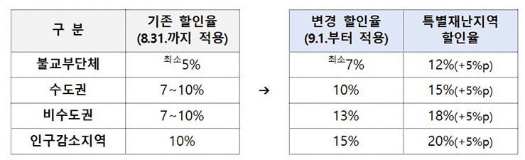 | 지역 유형 | 기존 할인율 | 변경된 기본 할인율 | 특별재난 시 추가 혜택 |
